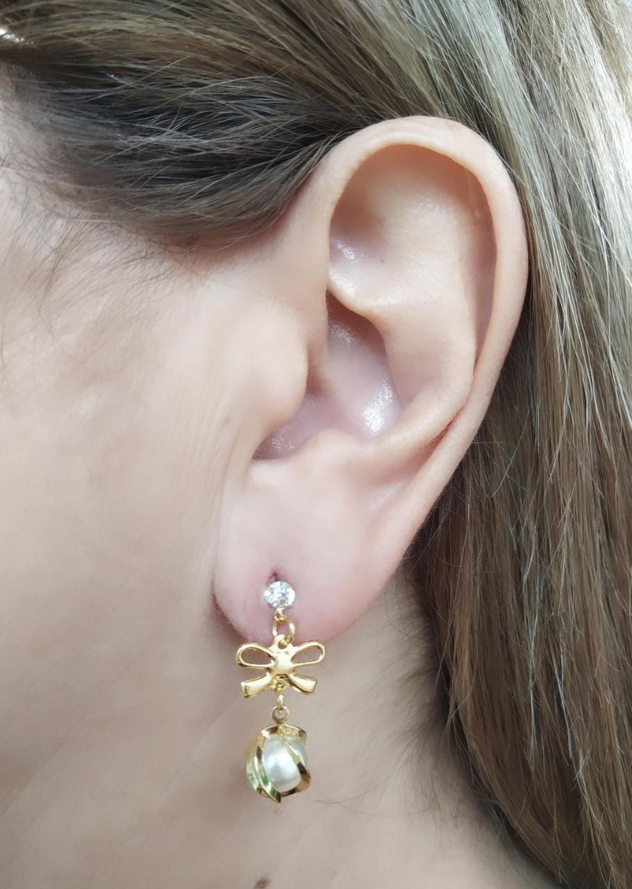O brinco é composto por um pedra de zircônia, seguido de um laço sutil e uma pérola logo a baixo para finalizar, deixando esse acessório delicado e sofisticado.