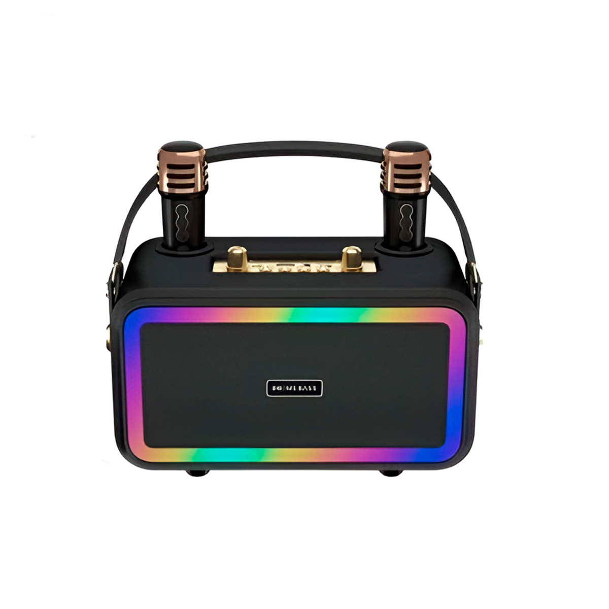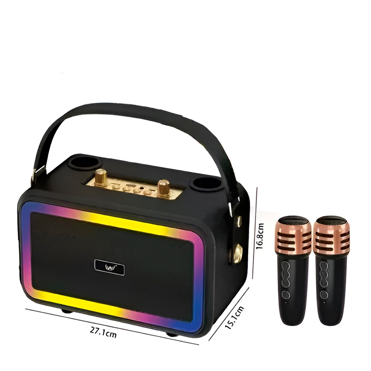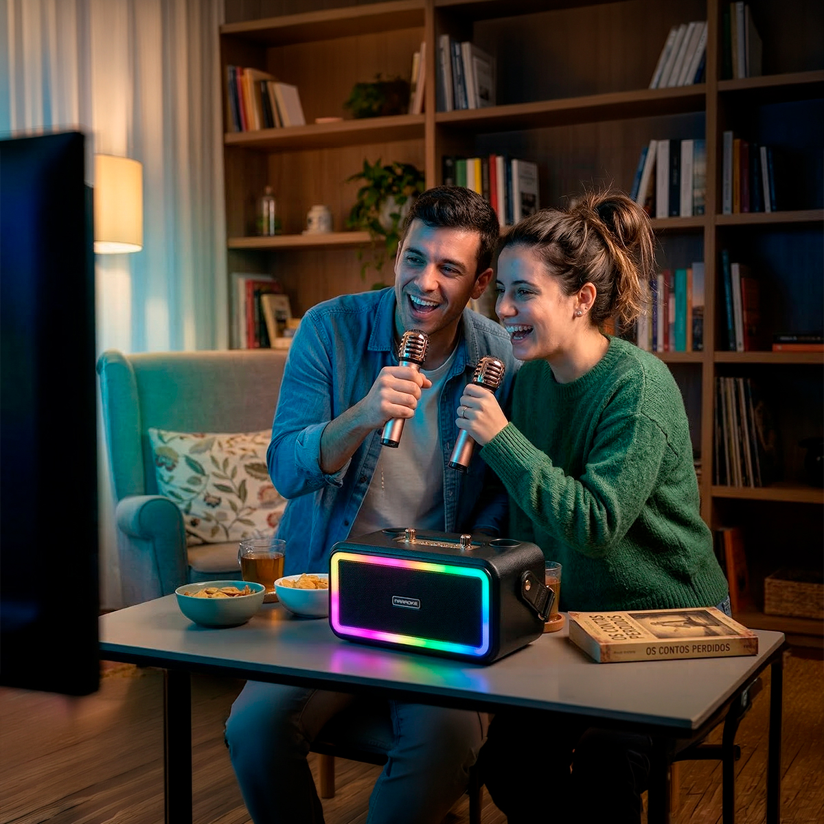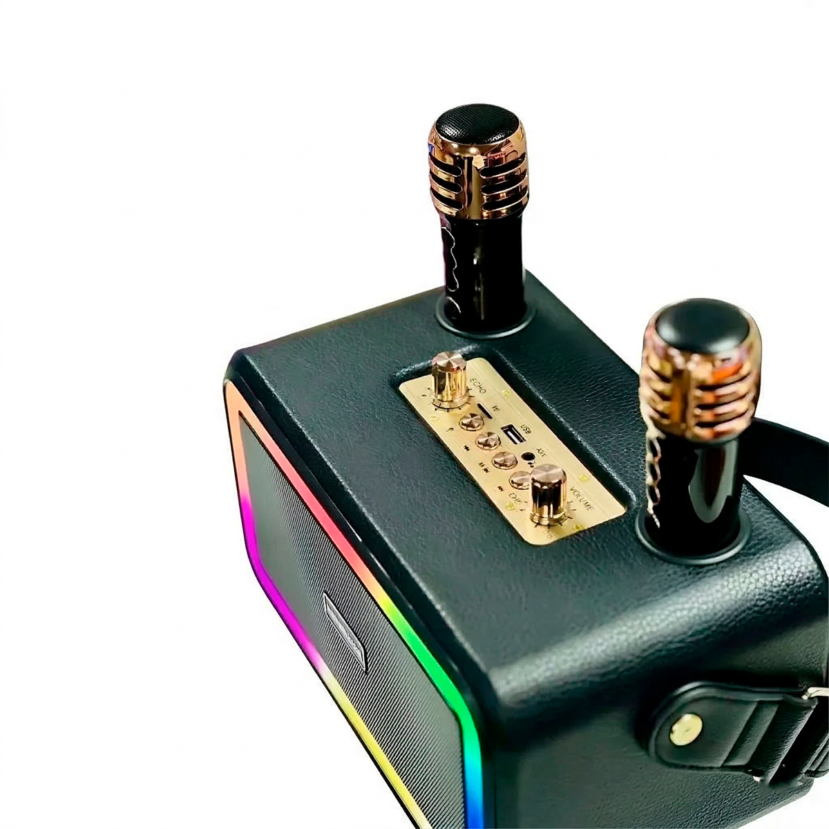 Transforme qualquer lugar em um palco real! Perfeita para festas em família, resenhas com amigos ou para presentear quem ama soltar a voz, ela oferece um som cristalino e graves profundos. -Pareamento rápido e estável com smartphones, tablets e smart TVs. -LEDs dinâmicos que criam uma atmosfera de festa vibrante. – Combina um design compacto e retrô com uma potência surpreendente. Especificações Técnicas: – Material: Plástico/Componentes elétricos – Dimensões Aprox.: 16,8cm (ALTURA) x 27,1cm (LARGURA) x 15,1cm (PROFUNDIDADE) – Cor: Preto – Potência: 100W – Autonomia: 6h – Bateria: 18650 3600mAh – Alto falante: 78mm – Conectividade:TF, FM, USB e Bluetooth – Luz LED RGB Itens Inclusos: – 01x Caixa de som – 02x Microfone – 01x Manual – 01x Cabo USB