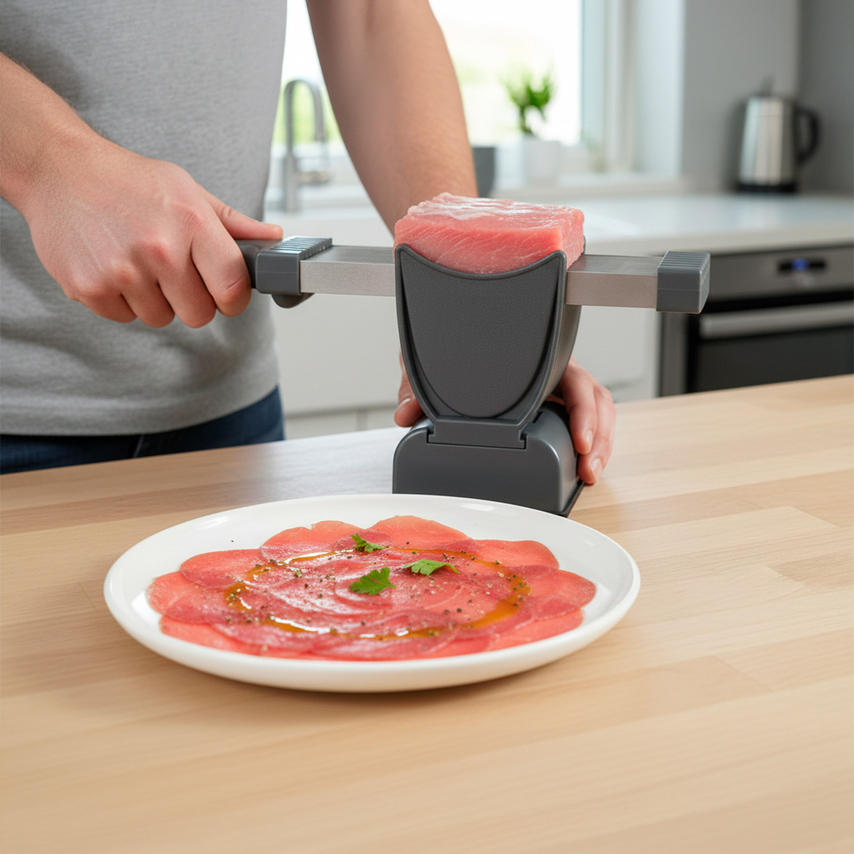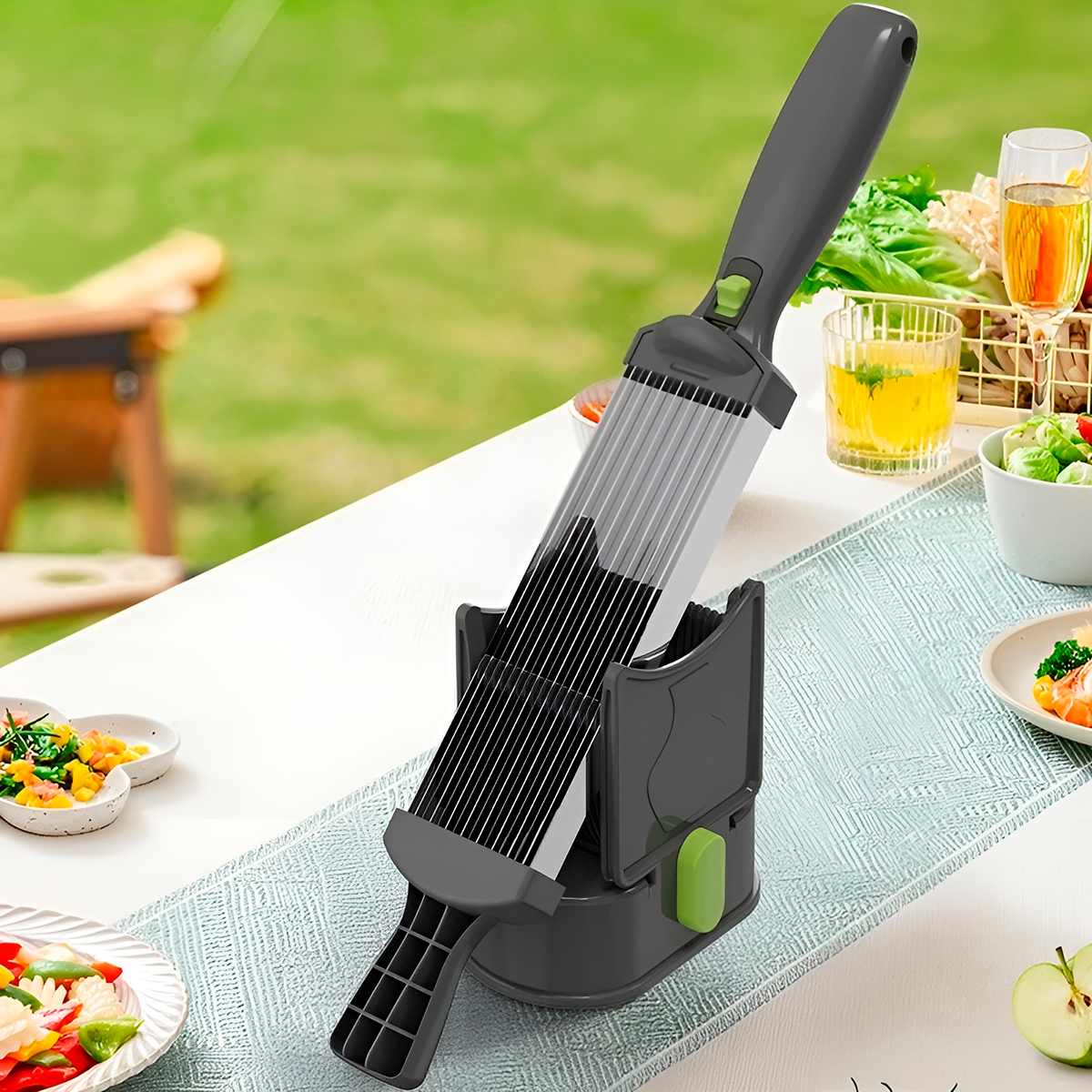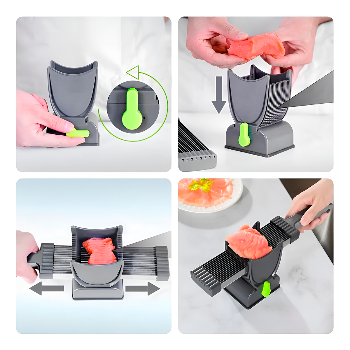 Cansado de sofrer com facas cegas e fatias irregulares? Eleve o nível da sua culinária com este utensílio projetado para quem busca a precisão de um chef profissional com a praticidade que o dia a dia exige. -Seja para fatiar carnes para o churrasco, preparar aquele carpaccio perfeito, cortar frios de forma uniforme ou fatiar legumes rapidamente, este cortador é a ferramenta definitiva. -Com lâminas de alta performance, ele reduz o esforço e economiza metade do seu tempo na cozinha. -Design ergonômico que mantém suas mãos longe das lâminas, com base antiderrapante que garante estabilidade total durante o uso. Especificações Técnicas: – Material: Plástico/Aço inox – Dimensões Aprox.: 13cm (ALTURA) x 8,5cm (LARGURA) – (BASE) / 33,5cm (COMPRIMENTO) x 5,6cm (LARGURA) – (CORTADOR) – Cor: Cinza com verde – Espessura: 2mm Itens Inclusos: – 01x Cortador