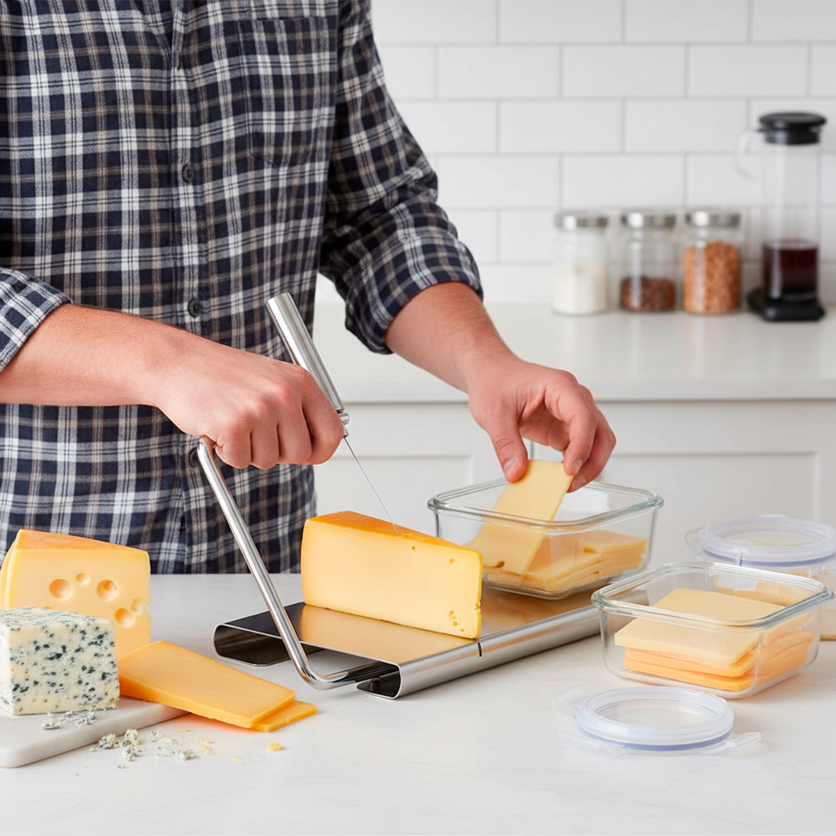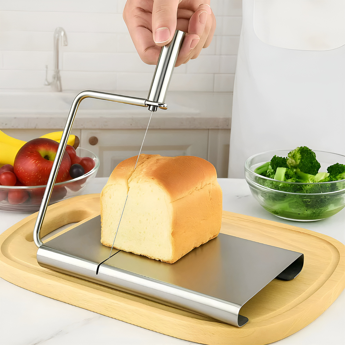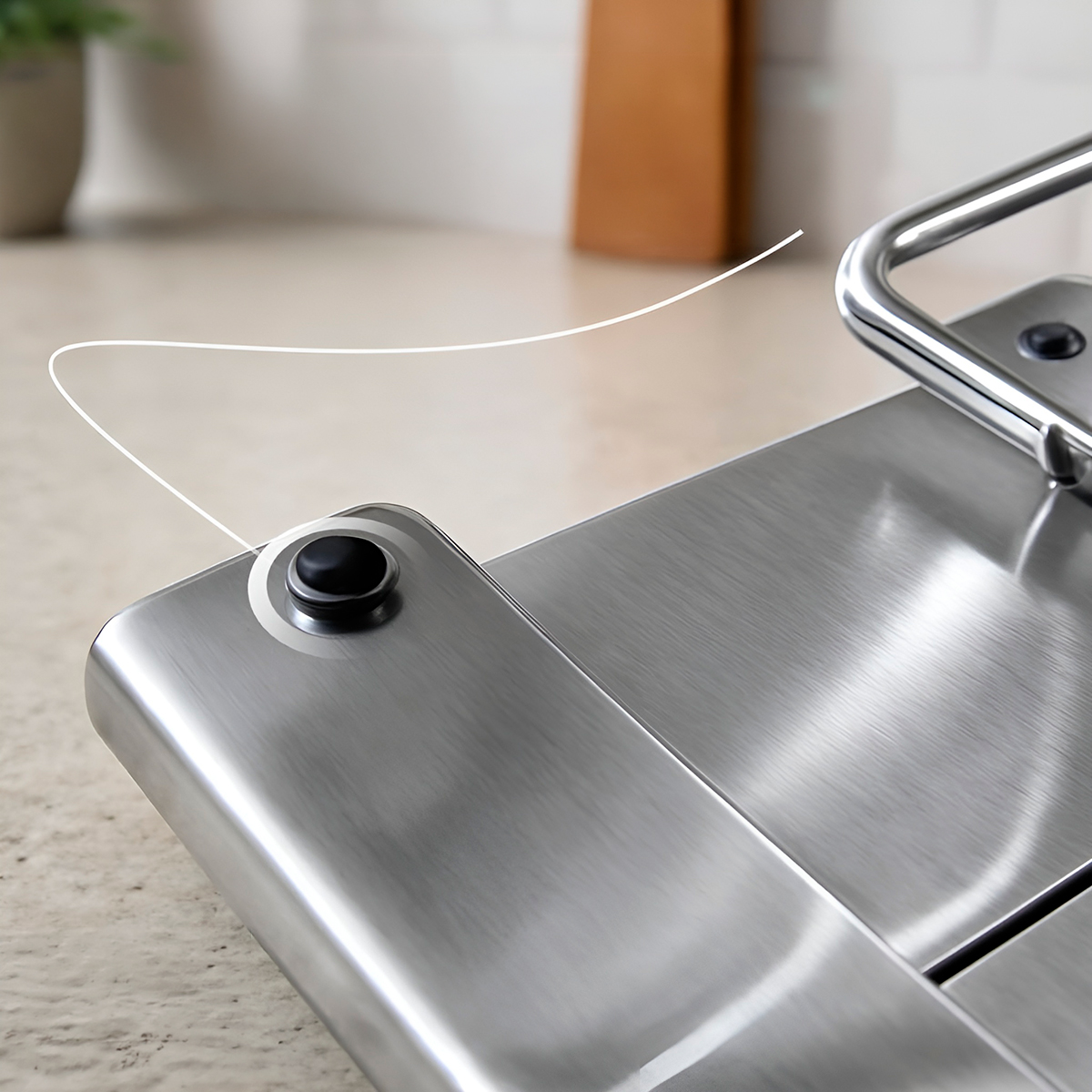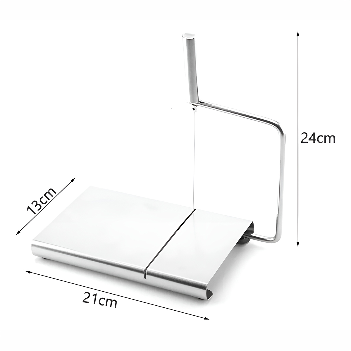 Diferente das facas tradicionais, o fio de corte desliza suavemente pelos alimentos, garantindo que a estrutura do item permaneça intacta. Aferramenta definitiva para quem busca fatias uniformes, limpas e profissionais na cozinha. -O fio de aço inoxidável proporciona um corte fino e preciso, ideal para queijos macios ou duros e pães caseiros. -Um único utensílio para diversos alimentos: queijos, manteiga, pães de forma, bolos, massas de biscoito e muito mais. -Cabo projetado para oferecer firmeza e conforto, reduzindo o esforço manual durante o uso. Especificações Técnicas: – Material: Aço inox – Dimensões Aprox.: 21cm (COMPRIMENTO) x 13cm (LARGURA) x 24cm (ALAVANCA) – Cor: Prateado -Fio de corte preciso Itens Inclusos: – 01x Cortador – 01x Fio de reposição