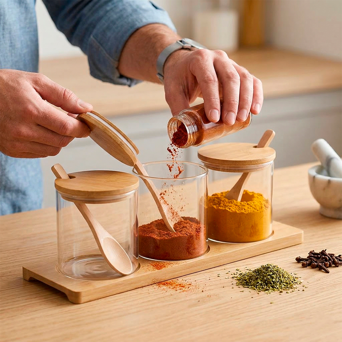 Leve organização, sofisticação e um toque de sustentabilidade para a sua cozinha! Este conjunto é a escolha perfeita para quem busca unir o rústico ao moderno. -Feito em bambu de alta qualidade, ele possui propriedades naturais que evitam a proliferação de bactérias, garantindo que seus condimentos fiquem frescos por muito mais tempo. -Cada pote acompanha sua própria colher de bambu e uma tampa com encaixe perfeito para a colher, mantendo tudo vedado e organizado. -O suporte incluso mantém os três potes alinhados, evitando que deslizem na bancada ou no armário. Especificações Técnicas: – Material: Bambu/Vidro – Pote: 8,5cm (ALTURA) x 8cm (DIÂMETRO) – Cor: Bege – Base: 28,5cm (COMPRIMENTO) x 9,5cm (LARGURA) – Capacidade: 300ml – 7 peças Itens Inclusos: – 03x Potes com tampa – 03x Colheres – 01x Base