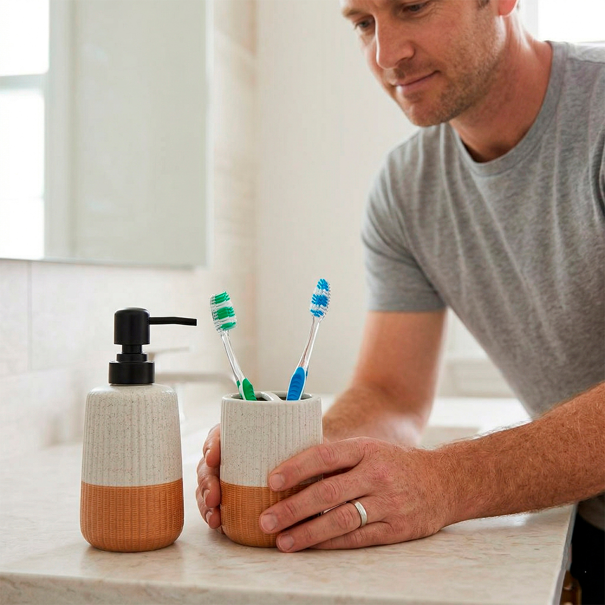 Transforme o visual do seu banheiro ou lavabo com este kit exclusivo que une praticidade e sofisticação. Com um design moderno e acabamento impecável, este conjunto é o detalhe que faltava para deixar seu ambiente mais organizado e com um toque de hotelaria de luxo. -O dispenser de sabonete permite comprar refis econômicos, reduzindo o uso de embalagens plásticas descartáveis. -Combina facilmente com qualquer estilo de decoração, do rústico ao contemporâneo. -Com válvula pump de alta precisão que evita desperdícios e garante uma saída suave do produto. Especificações Técnicas: – Material: Cerâmica – Capacidade: 360ml – 2 peças – Porta sabonete líquido: 16,8cm x 8cm (DIÂMETRO) – Porta escova: 9,6cm (ALTURA) x 8cm (DIÂMETRO) Itens Inclusos: – 01x Porta Sabonete – 01x Porta escova