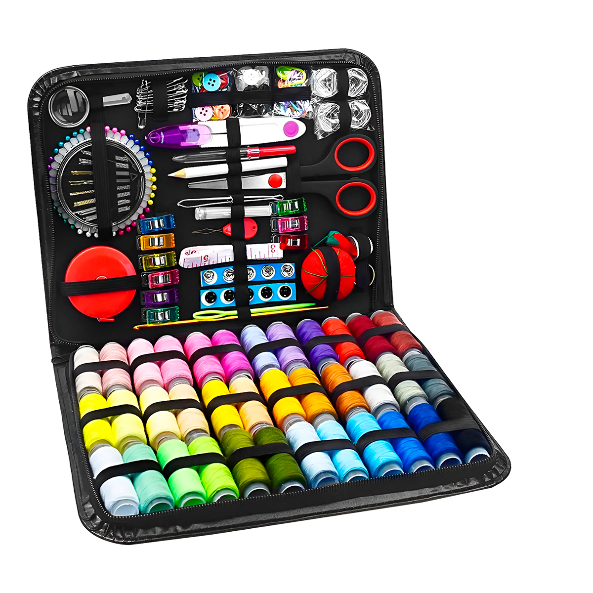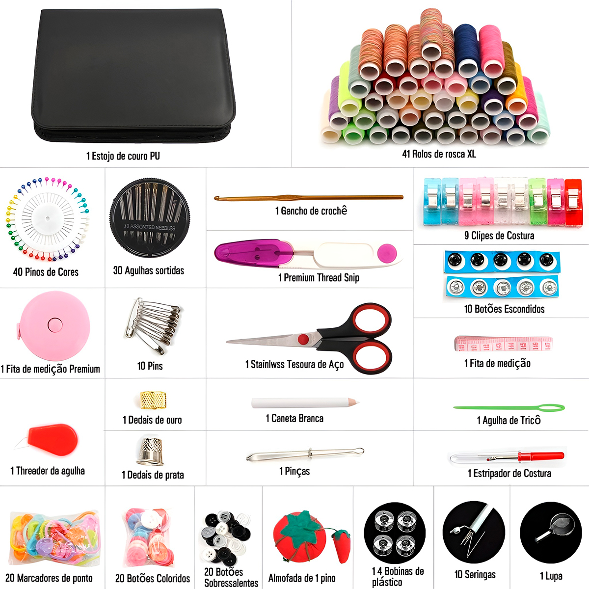 Tenha em mãos a solução definitiva para qualquer reparo ou projeto de costura! Reúne todos os itens essenciais em um único estojo compacto e organizado. -Seja para pregar um botão de última hora, fazer a barra de uma calça ou criar peças do zero, este kit oferece ferramentas de alta qualidade que facilitam o trabalho. -Design inteligente que ocupa pouco espaço em gavetas ou malas, ideal para emergências domésticas ou profissionais. -Perfeito para ter em casa, levar em viagens ou presentear quem ama artesanato. Especificações Técnicas: – Dimensões Aprox.: 20cm (LARGURA) x 4cm (ALTURA) x 26cm (COMPRIMENTO) – Cor do estojo: Preto – 229 peças – Material: Plástico/metal/tecido Itens Inclusos: – 01x Estojo – 41x mini rolos de linha – 30x Agulhas – 10x Alfinetes de segurança – 01x Mini tesoura – 01x Caneta branca – 01x Pinça – 01x Agulha de tricô – 01x Dedal de prateado – 01x Dedal dourado – 01x Fita métrica – 01x Threader da agulha – 01x Threader premium – 01x Fita métrica premium – 10x Botões escondidos – 09x Clips de costura – 20x Marcadores – 01x Estripador – 20x Botões coloridos – 20x Sobressalentes – 01x Mini lupa – 14x Bobinas de plástico – 01x Almofada
