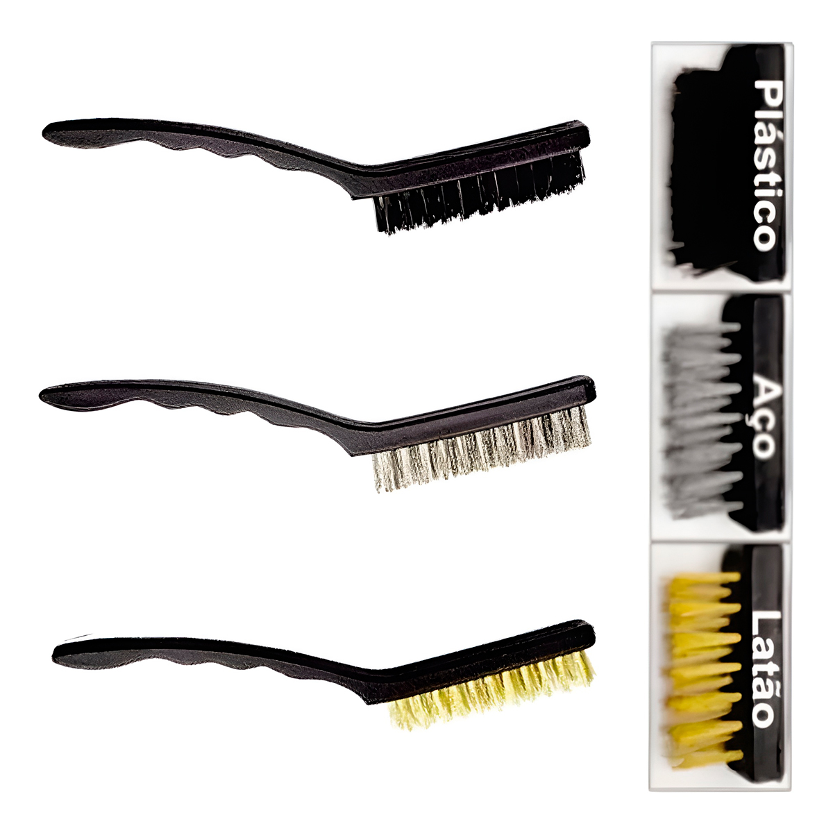 Revolucione sua limpeza! Perfeito para limpeza pesada, este conjunto é a solução ideal para deixar grelhas, panelas e rejuntes brilhando, sem esforço e sem danificar as superfícies. -Possui cabo de plástico resistente e ergonômico. -Remoção de gordura queimada, resíduos carbonizados e sujeira pesada em grelhas, churrasqueiras e utensílios de ferro fundido. -Cada escova é otimizada para um tipo de sujeira, garantindo resultados profissionais. Especificações Técnicas: – Material: Nylon/Latão/Aço/ABS – Dimensões Aprox.: 21,5cm (COMPRIMENTO) – Cor: Preto – 3 escovas Itens Inclusos: – 01x Escova de nylon – 01x Escova de latão – 01x Escova de aço