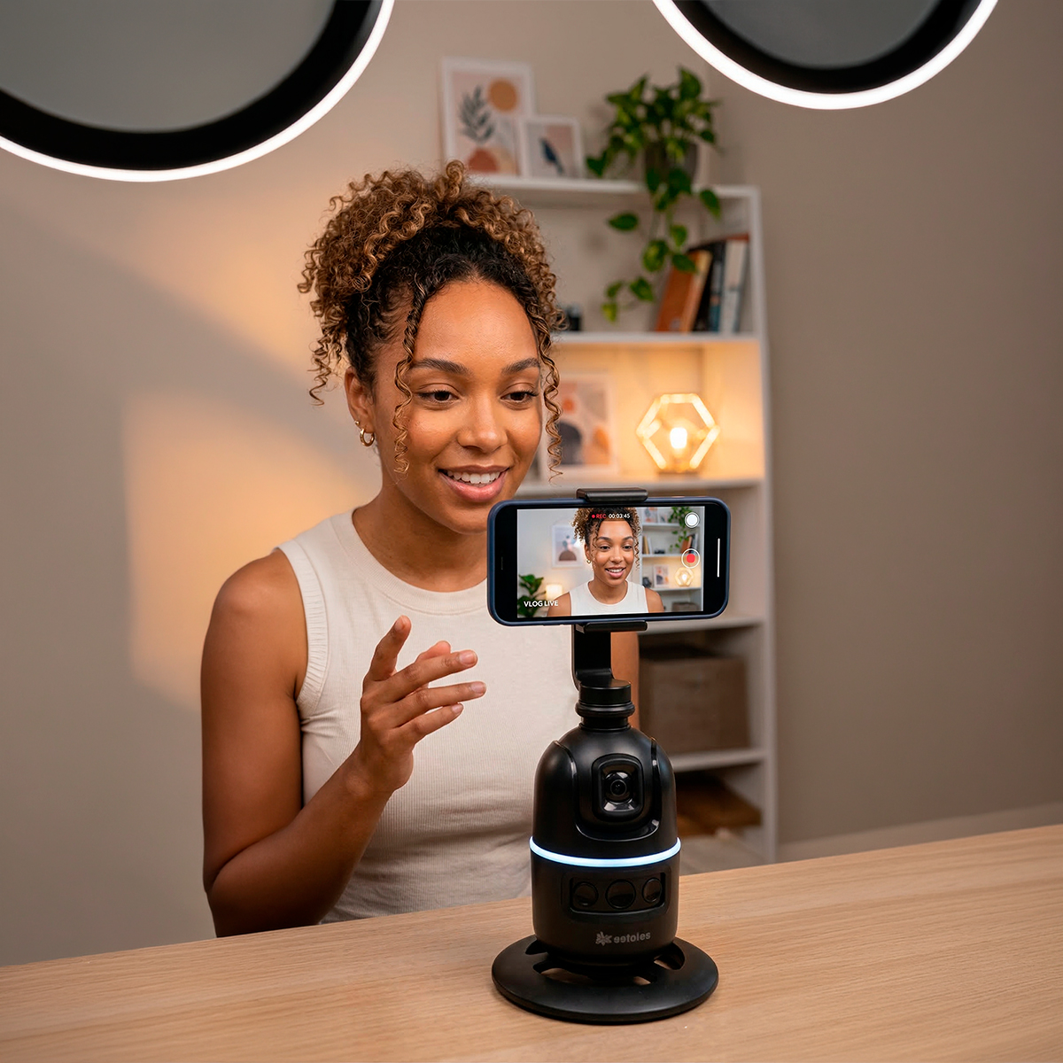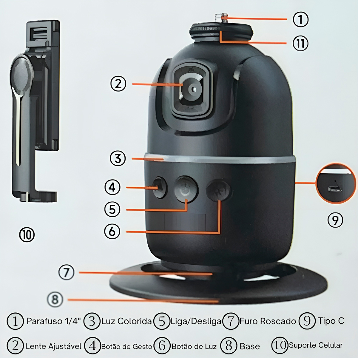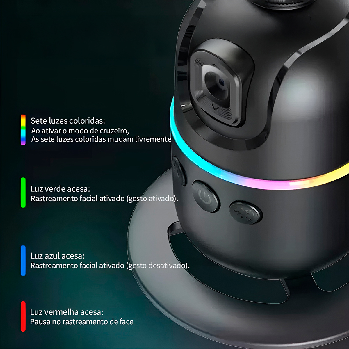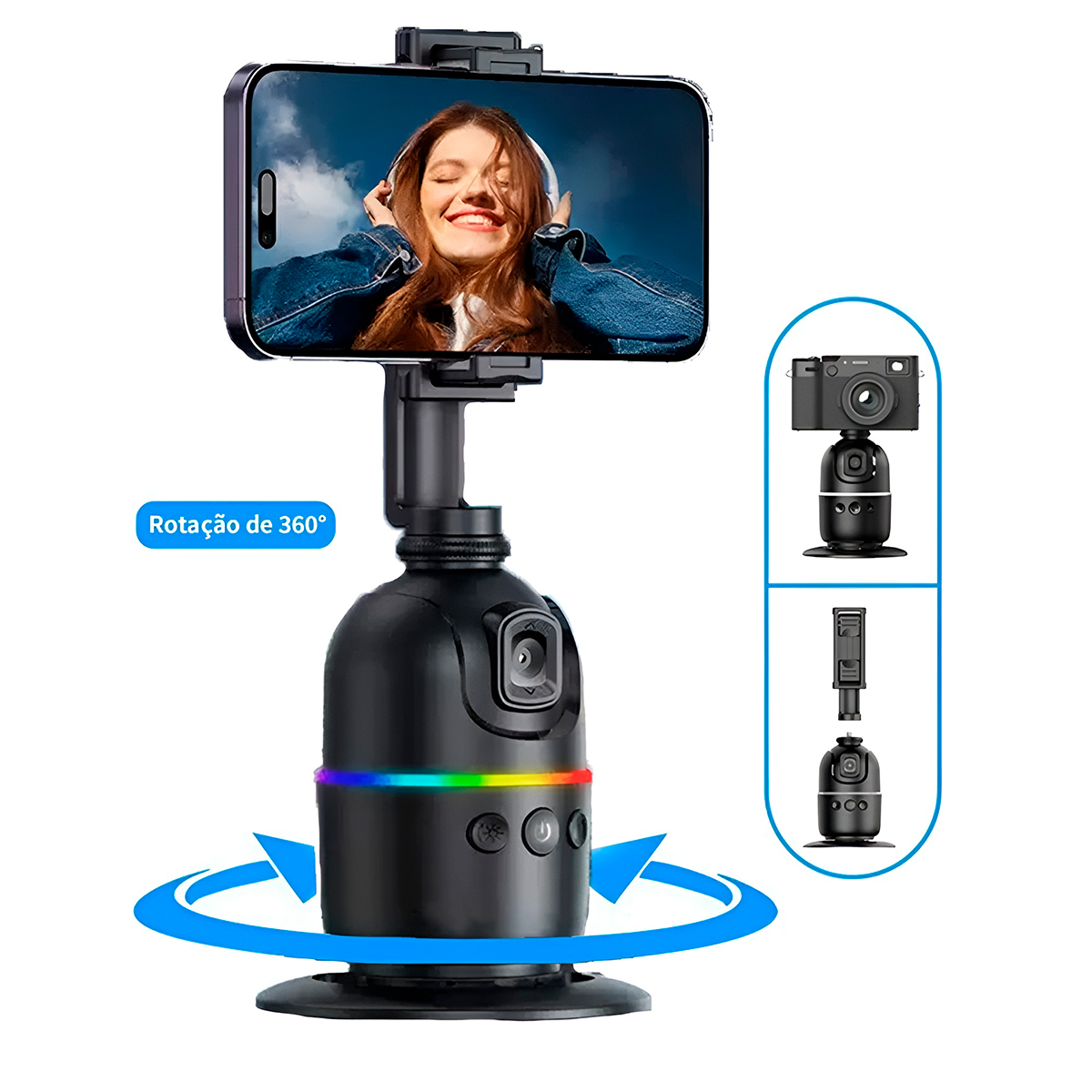 Se você é criador de conteúdo, faz videochamadas, grava treinos ou adora registrar momentos em família! Com tecnologia de última geração, ele acompanha seus movimentos automaticamente, garantindo que você esteja sempre no centro da imagem. -Possui rosca padrão de 1/4″ na base, permitindo o uso em tripés externos. -Liberdade total de movimento sem sair do enquadramento. – Não requer instalação de aplicativo. Especificações Técnicas: – Material: ABS/Componentes elétricos – Potência: 3W – Bateria: 1200mAh – Cor: Preto – Tensão: 3,7v – Rotação: 360° – Suporta aparelhos de 65mm – 95mm – Distância: 4m – Tempo de carregamento: 5h – Controle por gestos Itens Inclusos: – 01x Suporte – 01x Cabo USB – 01x Base – 01x Manual