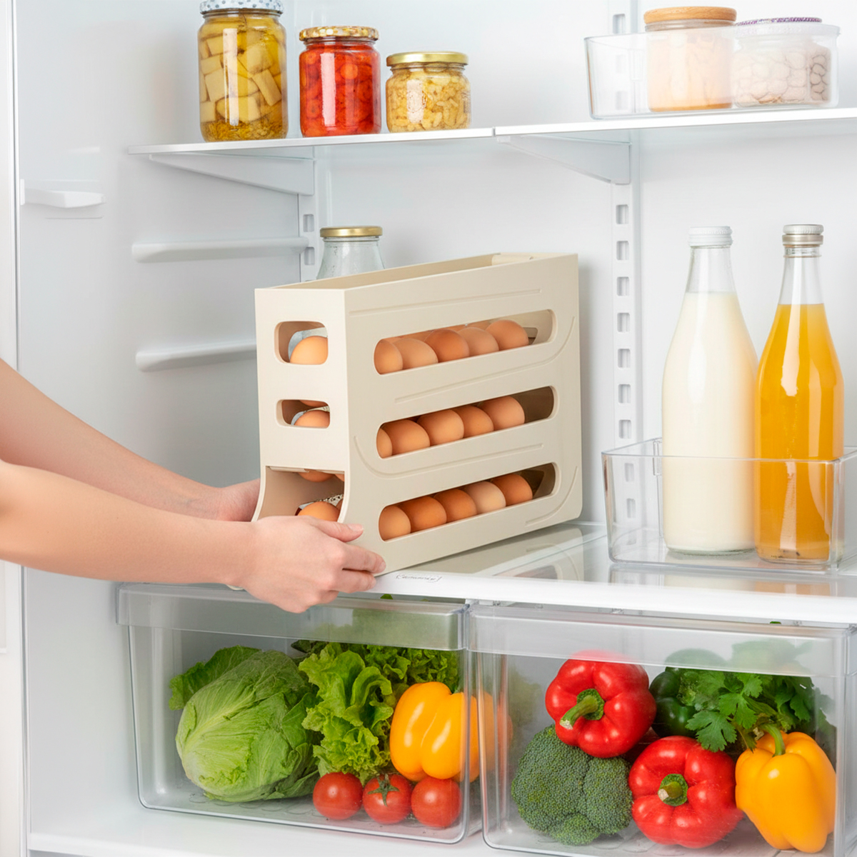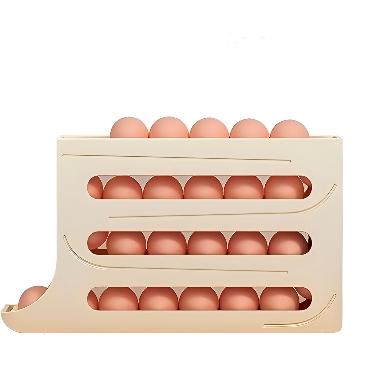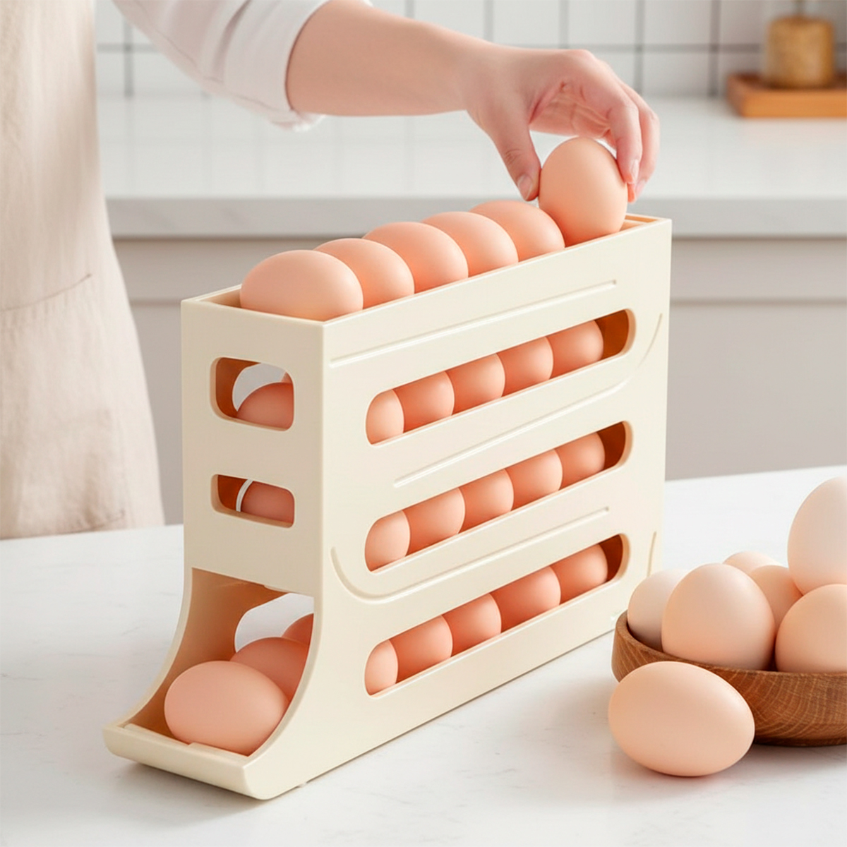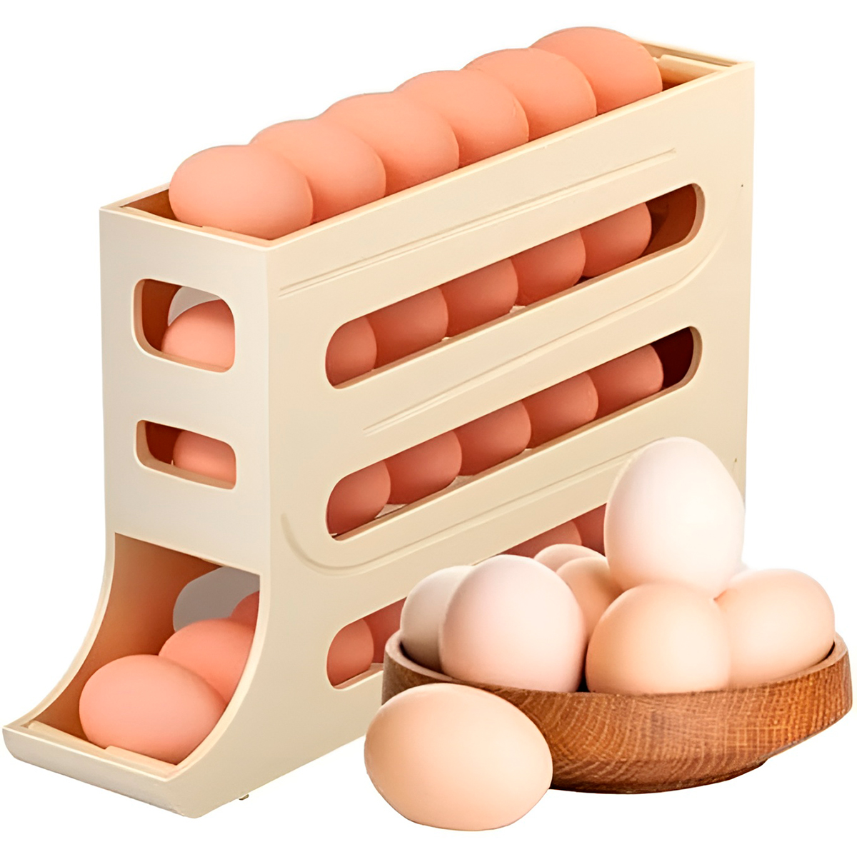 Chega de pilhas de caixas de papelão ocupando espaço ou do medo de quebrar os ovos ao abrir a geladeira! Para quem busca uma cozinha moderna, limpa e funcional. -Formato vertical e estreito que ocupa o mínimo de espaço, permitindo colocar outros itens ao lado. -Design aberto que permite ver exatamente quantos ovos restam antes de precisar ir ao mercado. -Feito em plástico resistente, fácil de lavar e projetado para durar. Especificações Técnicas: – Material: Plástico – Dimensões Aprox.: 19,9cm (ALTURA) x 35,9cm (COMPRIMENTO) x 7cm (LARGURA) – Cor: Bege – 4 andares – Capacidade: até 24 ovos Itens Inclusos: – 01x Porta ovos
